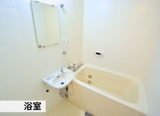 ↑白い壁タイルのシンプルな浴室